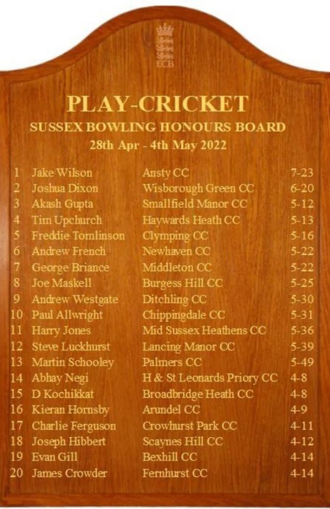 In last week’s Wizzy News we reported on Josh Dixon’s noteworthy bowling performance. As everyone may know, the scorecards of all games are uploaded to a centralised database called Playcricket which in turn publish the top batting and bowling performances for the 200 plus teams in the Sussex League.