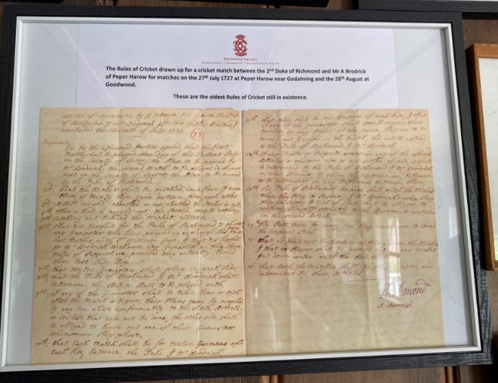 Inside the Pavilian was a framed copy of the oldest Rules of Cricket still in existence – drawn up in 1727 for a game between a Duke of Richmond side vs a Mr A Brodrick of Peper Harrow (near Godalming) side played on the same ground on 28 August 1727