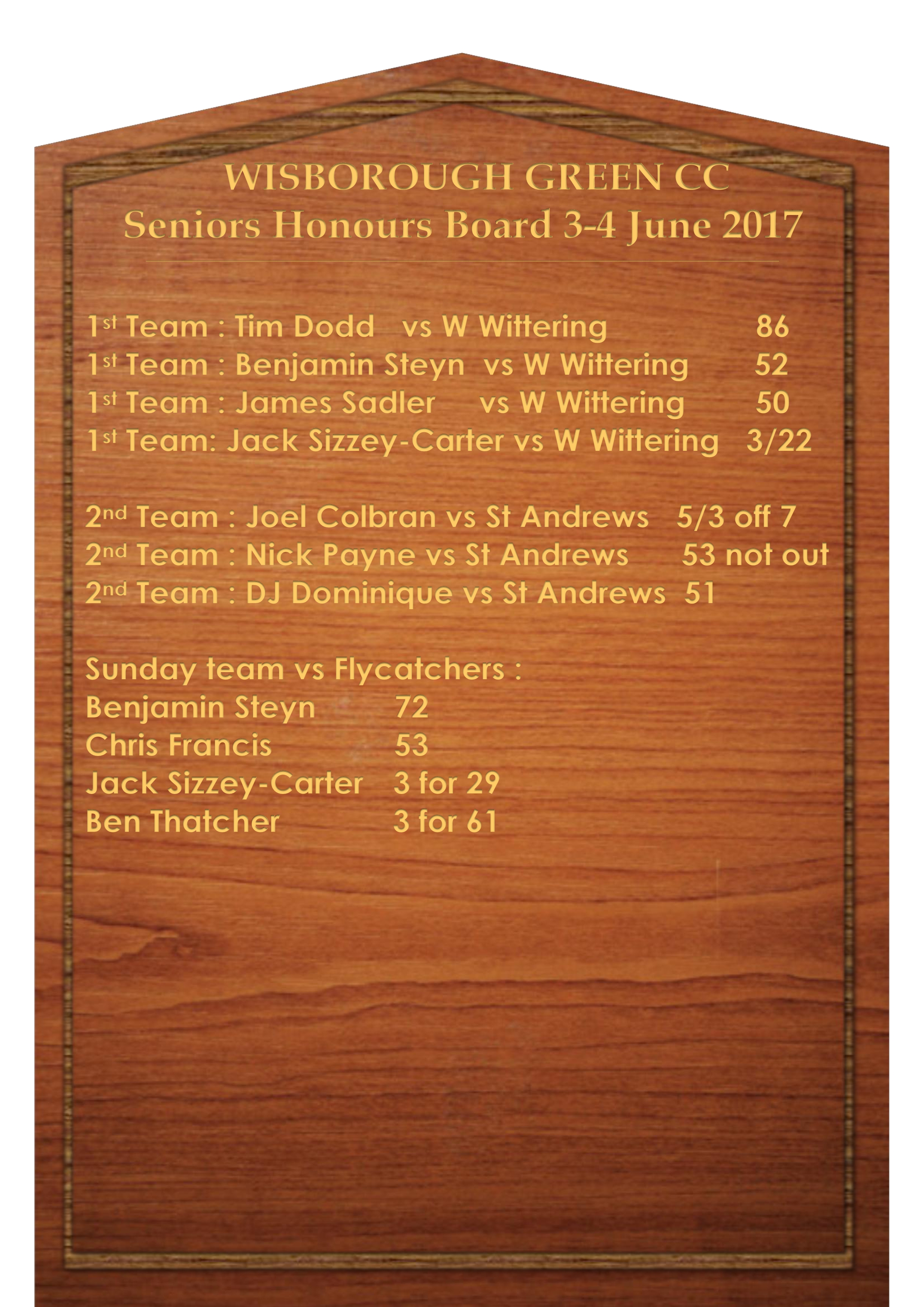 That’s it for this weekIf there is anything we need to know you know where to find us.Have another great cricketing week.#UpTheGreenStay safeCheersWizzyMatch ReportsFirsts vs West WitteringThe 1’s returned to the green and returned to winning ways with a fine performance with both bat and ball to secure 30 points against a good West Wittering side.The sun was out and the wicket looked excellent for batting which prompted skipper Sadler to have a bat when he won the toss.With recent opening partnerships not giving us the start we’ve wanted Sadler opted to revert to the opening pair that had served Green so well in the past. He and Tim “Doddy Smash” Dodd strode to the middle to take on the new ball.The decision paid dividends as, after a watchful start, the two really got the runs flowing. Sadler playing the holding role whilst Dodd began to smash the bowling to all parts. 130 runs were on the board at over 6 an over when Doddy, batting for a few overs with a hamstring strain, was caught in the deep for an excellent 86. Exactly the sort of start that Green were hoping for. Sadler soon got to his half century before he was brilliantly caught at square leg. 159 for 2.Benjamin Harm Steyn came to the crease at number 4 to make his debut. He was looking to do some serious harm to the West Wittering bowling figures. He and Byron batted well together and put on 50 for the 3rd wicket before Byron (31) was bowled. Steyn (51) continued to play his strokes though and scored an superb debut half century. After he was dismissed Green did suffer a mini collapse trying to move the score along. Thatcher in at 5 batted with 6 different partners on his way to an unbeaten 31. After their 49 overs though Wis had made a very tidy 271 for 8.Another delicious tea was consumed which this week included hot dogs and it was out into the field with the task of taking 10 West Wittering Wickets (say that after a few pints).The early bowling was a little loose and Wittering were looking to make a quick start. Green needed a bit of inspiration to get the ball rolling and they got it in the field. A mix up between the two batsmen saw them both stranded towards the bowlers end. Chris Francis had picked the ball up and was looking to throw to the bowlers end but quickly changed his mind and brilliantly threw down the stumps at the keepers end.The home side tightened up their lines with Thatcher and Napper bowling well. However WW were still playing their shots. Fortunately it was easier to set a field to as the bowlers were bowling one side of the wicket. The next wicket came courtesy of Thatcher. Lendrum went for a big shot but only ended up skying it and Thatcher had time to settle under it and take the catch. Thatcher struck again a couple of overs later when Feazey was caught brilliantly at silly mid-on by Martin Hopkins. Napper was the next bowler to strike when Tupper mis-timed a drive and only managed loop a catch to cover.4 down with only about 80 on the board and WW needed to regroup. They were beginning to stabilise things so a change in the attack was needed. Jamie Self came on up the hill and Jack Suzzey-Carter was brought on from the top end. It was Self who made the breakthrough with a slower ball which resulted in the batsman looping a catch to Steyn at mid wicket. His next slower ball and over or two later saw him take a good return catch. Sizzey-Carter got in on the act when a lofted drive was caught low down by a sprawling Jim Sadler. Hopkins then took a sharp catch at silly point and JSC had his 3rd wicket two overs later when he clean bowled Baker. With the Wittering number 11 unable to bat due to an injury he picked up in the field the game was over. The visitors dismissed for 153 and Wis had completed a very good days work.View from the skipper: Good batting performance, would have liked more runs from the last 10 overs so we could have declared early. Batsmen were just looking for the big shots rather than collecting singles and 2’s and hitting the bad ball. However good overall. Bowling and fielding was good. Team spirit on the field is good. Still only performing at 75% of where we need to get to!Seconds : Commanding performance sees Seconds secure a big win against St AndrewsThe presence of 6 players who have played for the firsts this season alongside others who have been regulars in the past meant that the skipper took a strong team to St Andrews. SCS won the toss and decided to bat confident that if the batsmen could secure sufficient runs then the strength of bowling would bring a win.With the strongest batting line up this season he could have chosen any number of batting orders but after much soul searching settled on his line-up with the help of a tombola. The master strategy was going perfectly until the second ball of the innings when SCS offered catching practice off his first ball and was dismissed. Not the most positive start. However it meant that he had all afternoon to man the score board which was probably the most productive thing he did all day.However the Tank settled in for a typically Frank like innings and our resident accountant Jack looked very comfortable playing a couple of nice shots and the team recovered to about 30 for 1 off ten overs. Jack inexplicably chipped the ball to mid-wicket and was caught. This brought two significant changes to the game. The hustle and bustle of George Nicholls to the wicket and the Accountant to man the score book. George carried on from his last innings and played some lovely shots scoring a breezy 33 without looking in danger until bowled by turning a half volley into a Yorker.We were 80 for 3 off about 20 overs and this brought Joel to the crease. Sadly Frank lost his wicket after a solid 38, and that meant we had greased lightning at the crease as DJ joined Joel. However, quick as these two batsmen were they needed to be on the same wavelength, as Joel looked to pick up a ball trapped by his feet he found DJ in his face look