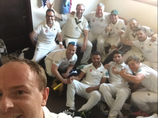 The last-wicket pair made a brave attempt to give their side victory. Shuttlewood struck Ben straight for the eighth six of the innings before, to especially noisy acclaim, Tillier struck Alan to the extra-cover boundary. When Shuttlewood hit Ben through mid-wicket for four, the target had been reduced to just 7 from 15 balls. From the second of these, in attempting to level the scores, Shuttlewood miscued his attempt drive against Ben very high into the air. Despite the ‘oohs’ and ‘ahs’ from a fairly large crowd at the pavilion, while the ball was in the air, Ben held his nerve admirably, holding the steepling caught-and-bowled a few metres to the right of the stumps. For the second time in three weeks, he had taken the final wicket in a very tight finish.