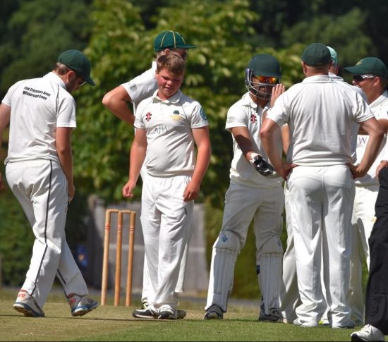 Harding continued to score runs almost as fluently as Alan had earlier, several savage pull strokes a particular feature of his innings. However, the stroke almost caused his downfall, Jamie surprisingly spilling his second chance of the innings, at deep mid-wicket, off James Rainford. “London buses” was Jamie’s sardonic comment soon afterwards. Although he had not had the happiest afternoon with the bat or in the field, Jamie was to produce a vital spell, however. In his first over, having been very close to bowling him with a delightful off-cutter from the previous ball, Jamie induced an inside edge from Harding (49) onto his stumps, from a ball of close to yorker length. 79 for 2 in the 12th over.