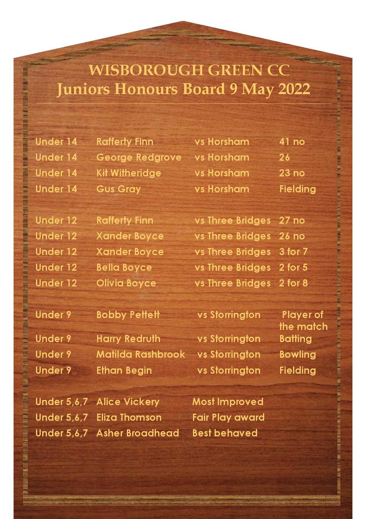 Below is a snapshot of the honours board for last week. Congratulations Josh for making it onto the board and keeping the Wisborough Green flag flying high.