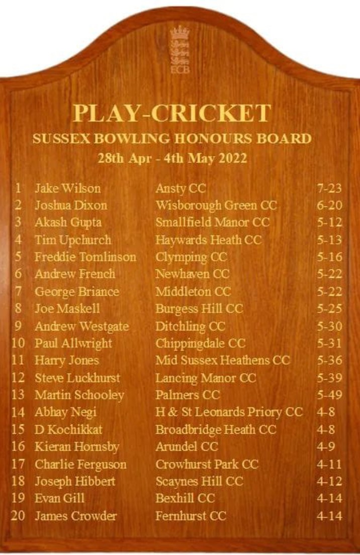 In last week’s Wizzy News we reported on Josh Dixon’s noteworthy bowling performance. As everyone may know, the scorecards of all games are uploaded to a centralised database called Playcricket which in turn publish the top batting and bowling performances for the 200 plus teams in the Sussex League.