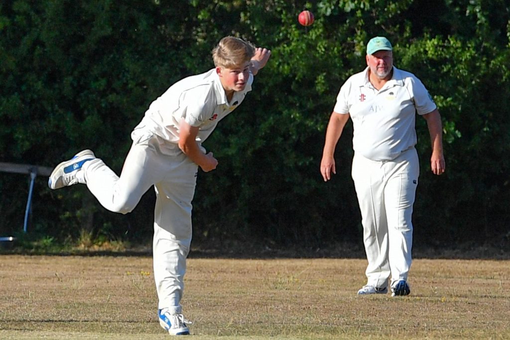 Toss lost, we were put into bat. A youthful opening pair of Will Dixon and Harry Hunter set off like the clappers. 31-0 off the first 4 overs with Will on 28 and Harry yet to score. To be fair Harry had only faced 2 balls and would spend the rest of the innings carving the ball to all corners. Will’s short sharp knock came to an end when he played on, bringing Oscar Warmington to the crease. Oscar looked suitably comfortable until he skied one to mid wicket on 9. Tim Dent hung around nicely, supporting Harry with a hard grafted 12 before being given out LBW.