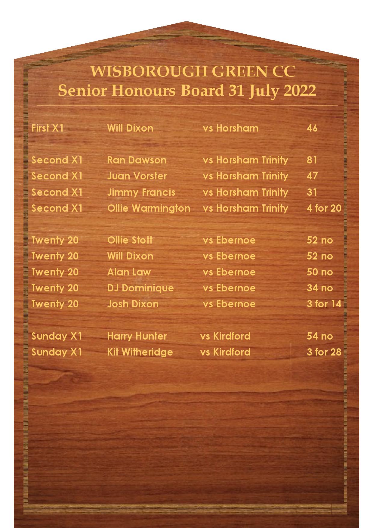 Ran Dawson steadied the ship with some fine batting and taking his chances after some poor fielding gave him a lifeline. Jimmy Francis made a welcome return to the crease in his customary game against Horsham Trinity. He played some great shots and hit numerous boundaries before finally being caught behind on 31.