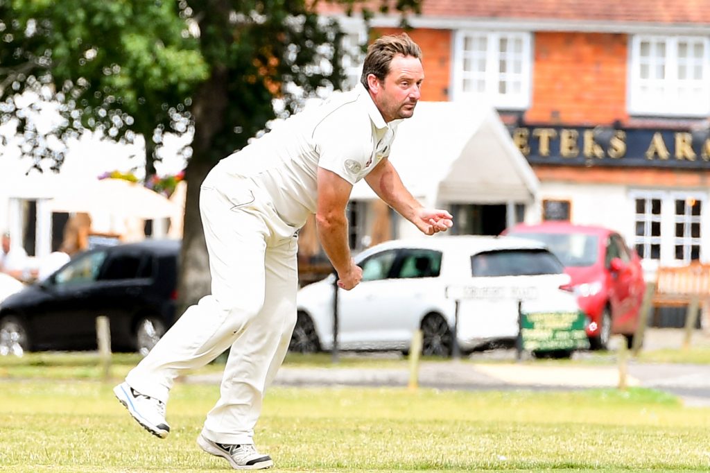 After a rapid start the run rate was pegged back as ex Berkshire and Horsham and Sussex Over 50s bowler, Tim Dodd, showed the virtue of a good line and length and Andy Spiers reminded us all of how sadly he is missed by the club with a fine spell of bowling. At the same time the president’s bowling attack was enhanced by the arrival of the self-proclaimed L.E.G.E.N.D Ben Thatcher. He was immediately handed the ball and was back into his old rhythm straight away. Tim Dodd was delighted as he could sit and recover for the remainder of the innings. Mick Holland batted well until chancing a second run to the best fielder in the match, JCS, and was run out convincingly.
