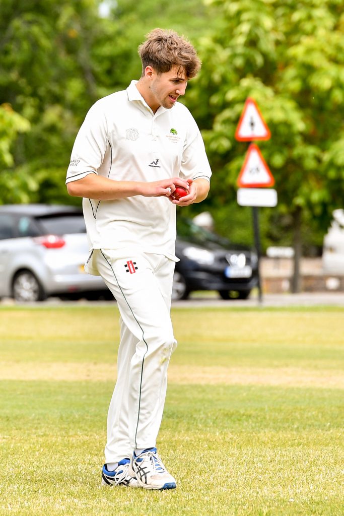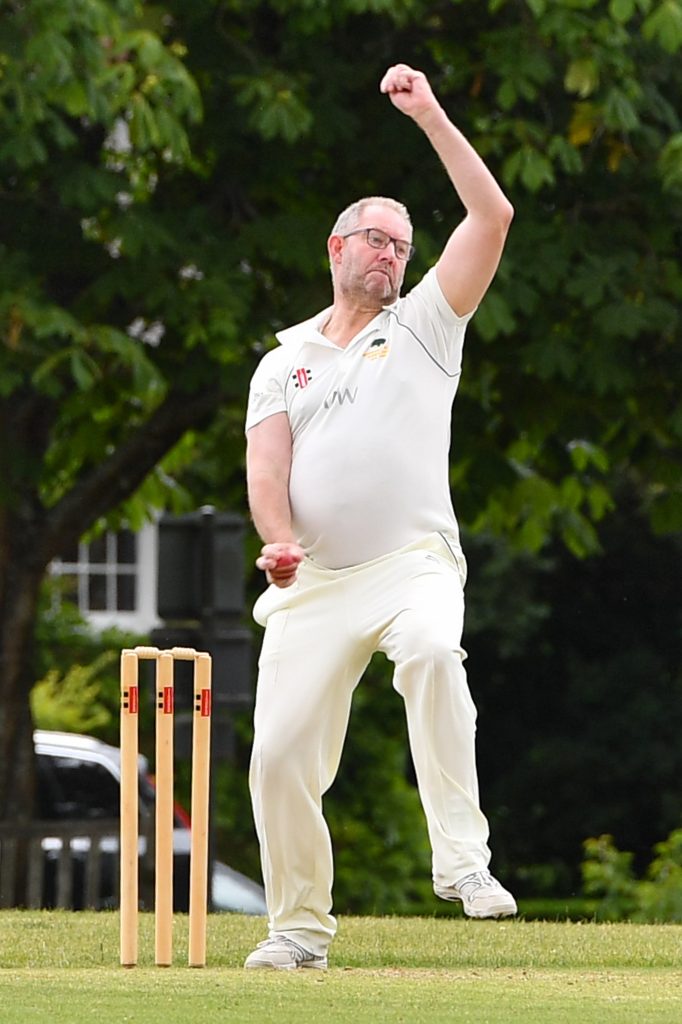 Joey opened from the Ken Vickery end bowling well to the hard-hitting opening pair of Matt Watts and Richard Wilson with the raw pace and late swing of George Nichols bowling up the hill. It was Nicholls who struck first when his variations of slower balls bamboozled Matt into an injudicious swipe which resulted in his middle stump being pegged back. A couple of balls later there was a chance to snare Richard at deep long on but perhaps Andy’s hands are a little softer these days with all his office work and the chance went begging. NSP was the next man to fall – it was great to see him back on the green – but in his own words he got an absolute beauty of a ball and snicked off behind the stumps.