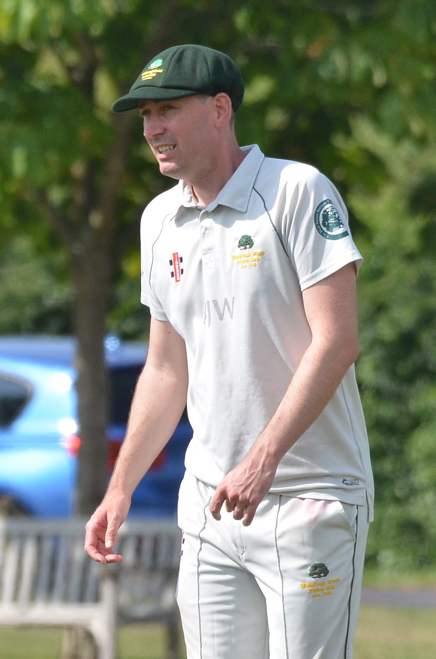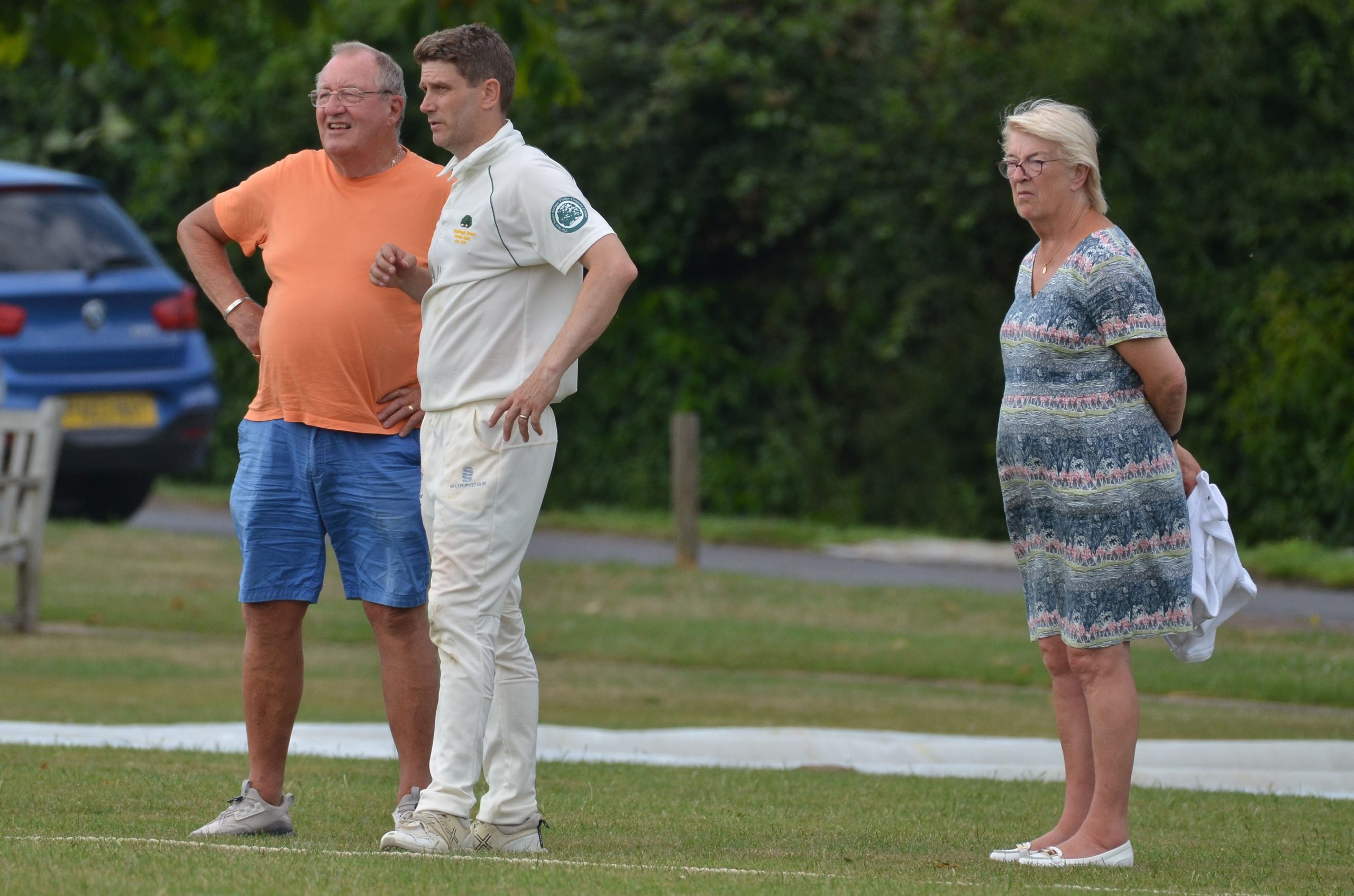 WG won the toss and elected to bat. Opening pair DJ Dominique and Chris Marshall put on 40 for the first wicket. DJ did a Zac Crawley and carved the first ball of the day to the boundary. The wicket was lively but true, and the bowling accurate. The Nuthurst captain warned me they had a young bowler who chucked it, but they were coaching it out of him. “Not a problem” – I replied. “It’s Sunday”! I regretted that with the fancy green stumps splayed behind me, but it gave me chance to get the tea sorted.