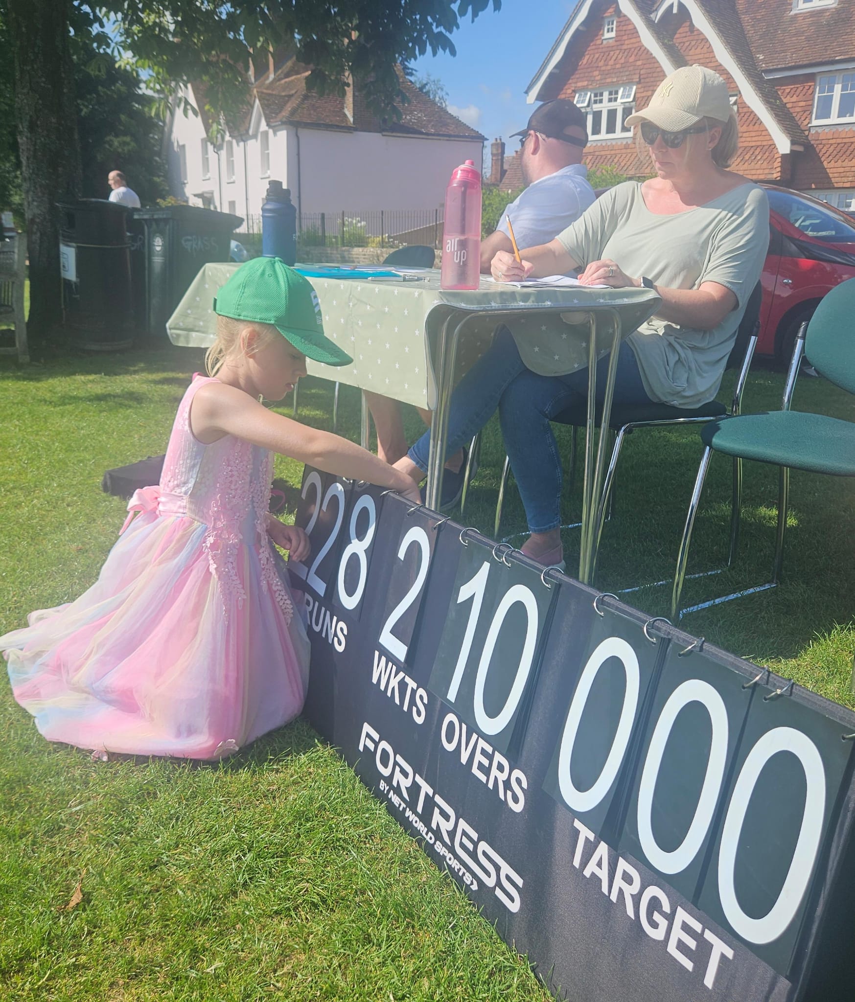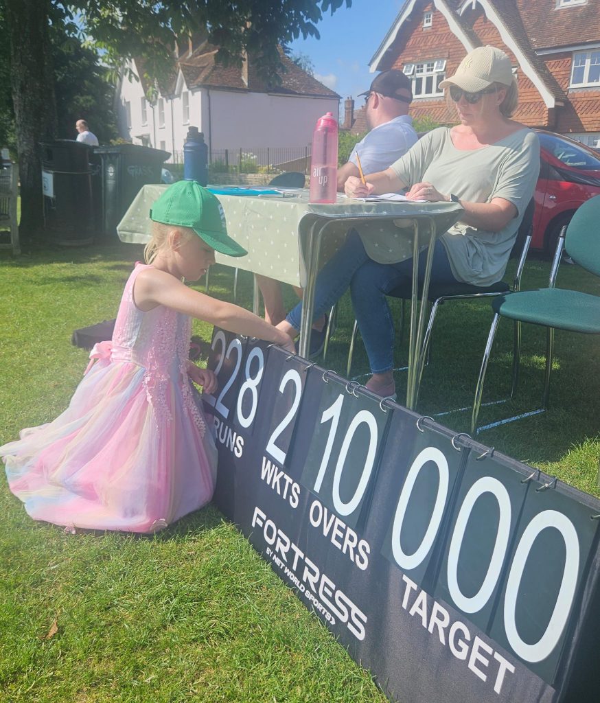 On to a sunny Sunday afternoon and the return match against West Chilt, whom we’ve played a few times now. After Tuesday’s match we organised an extra nets session to face the bowling machine, and with that and having won the Women’s tournament a couple of weeks ago, we were feeling positive. Thanks to Tessa for stepping in to score, helped by veteran scorer Jen Jones, who also rallies the support for every home game. Thank you!