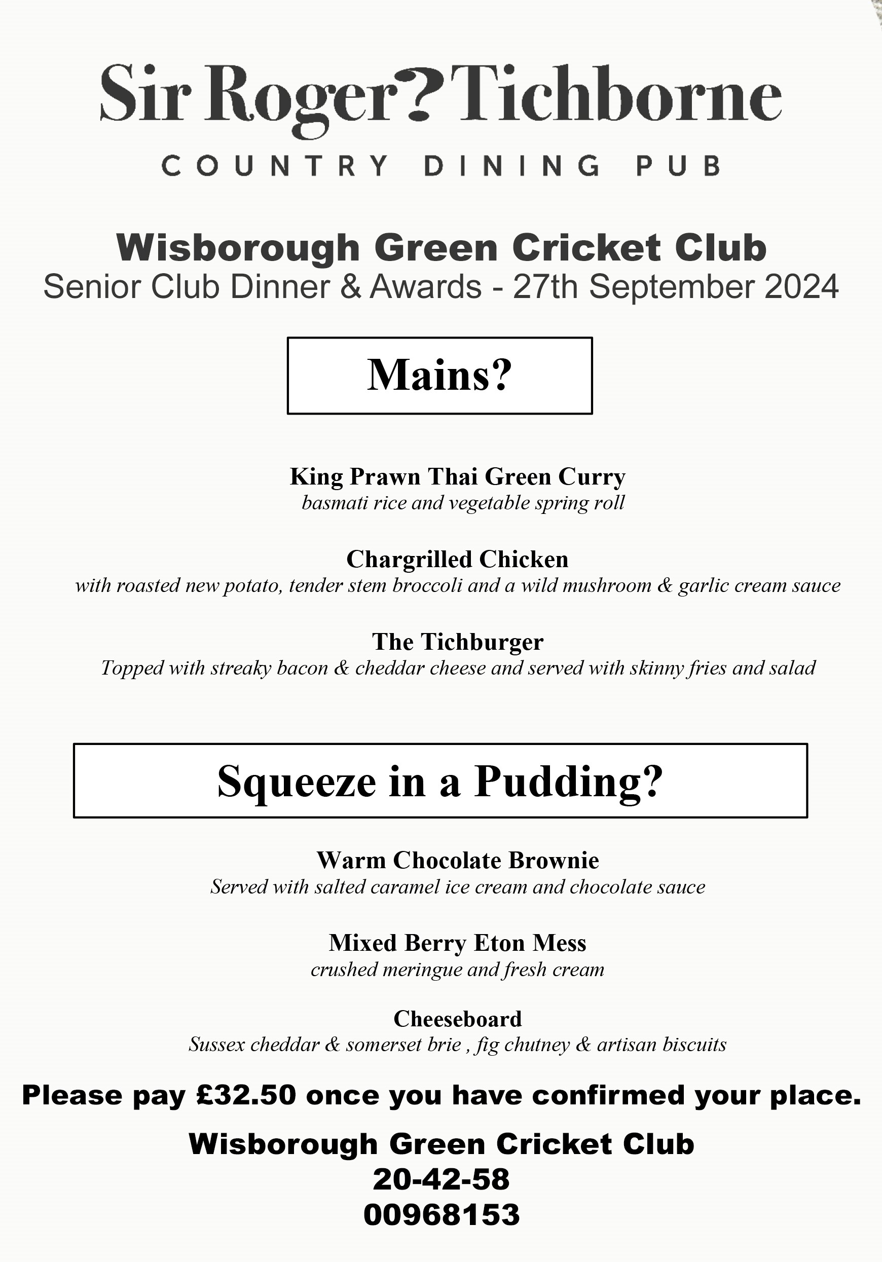 The Seniors End of Season Dinner will be taking place on Friday 27 September at the The Sir Roger Tichborne pub in Alfold – please make a note in your diaries. Places are limited so please book early.