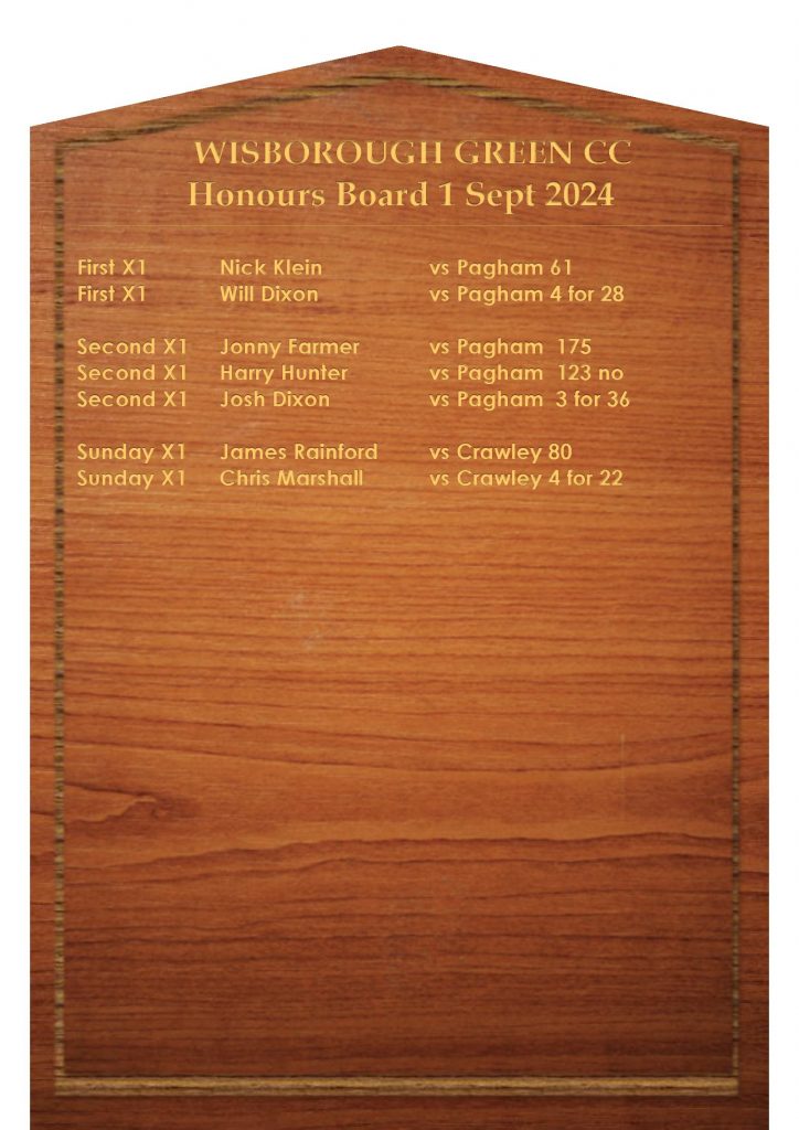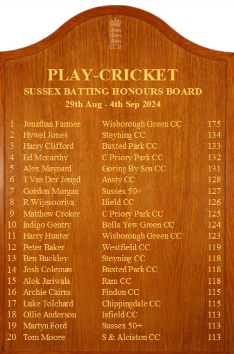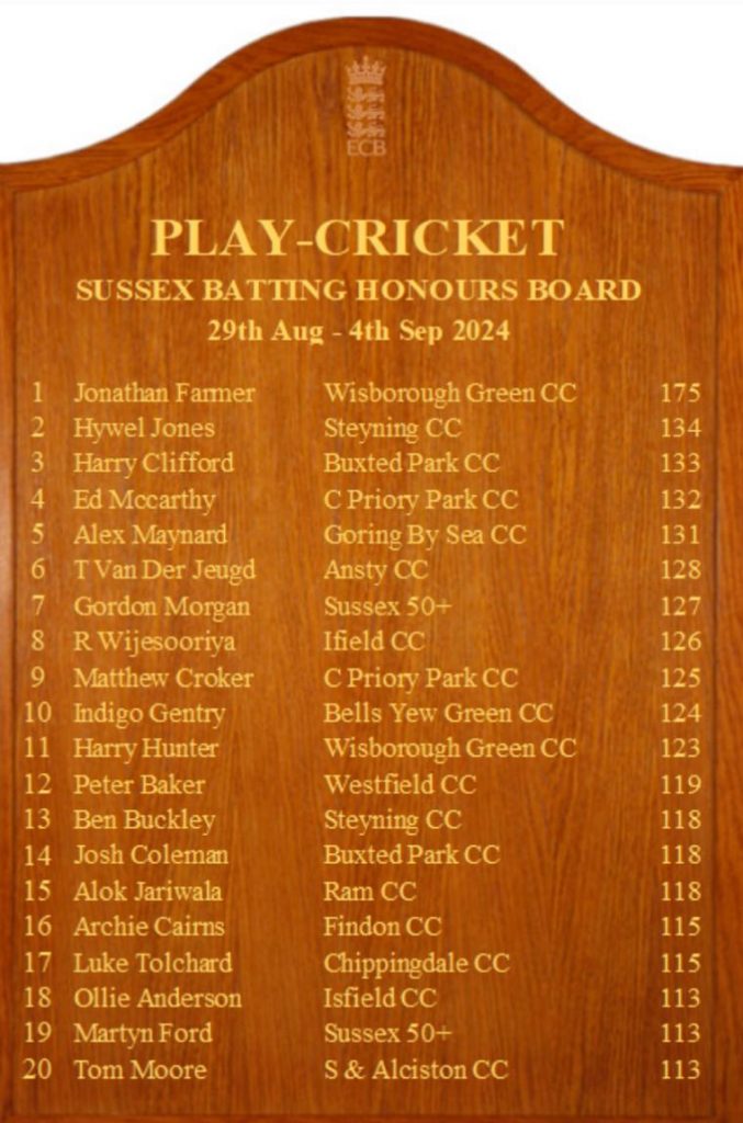 It’s not often that we have two player’s names appearing on the Sussex cricket League’s Honours board – even more special that we have someone topping the board by some margin. Congratulations Jonny Farmer and Harry Hunter.