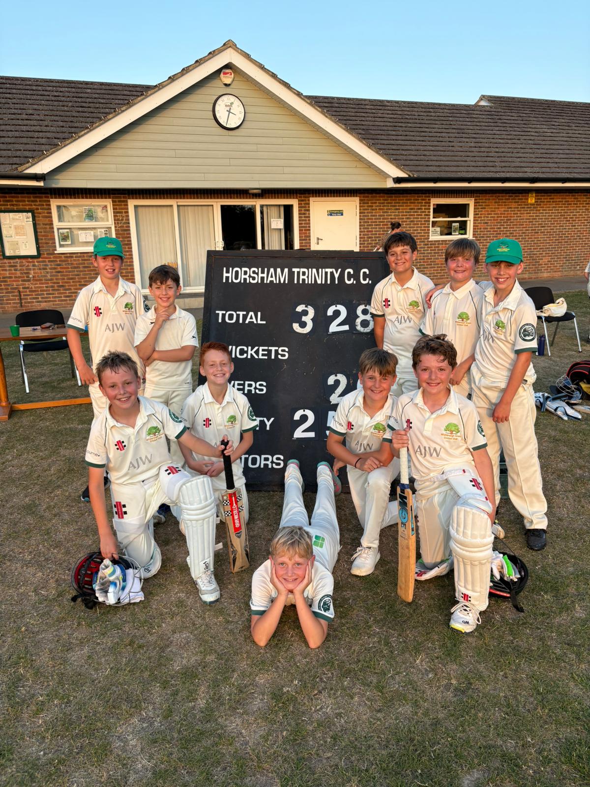 The Wisborough Green under 12’s should be really proud with their performance against Horsham Trinity. Despite the narrow loss (27 runs,) the bowling was tight and we saw Charlie Brown and Jack Brazier taking 2 wickets each. The fielding was also pleasing to see with three catches from Leo, Zachary and Dylan. Fielding was tight, Implementing all of the revised skills around backing up, walking in and staying alert in the field. Fortunately only 22 extras – which is a huge improvement on previous weeks and testament to the concentration of the fielders and training on Friday evening’s.